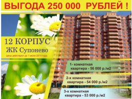 В период до 1 июля 2015 года застройщик «Гефест» предлагает приобрести квартиру в 12-м корпусе объекта «Супонево» по льготной стоимости с выгодой порядка 250 000 рублей. Так, стоимость одного квадратного метра однокомнатной квартиры составит 56 000 рублей, двухкомнатной – 54 000 рублей, трёхкомнатной – 53 000 рублей.